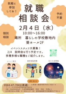 【就職相談会のお知らせ】 ●日時:2026年2月4日(水)10時~16時 ●場所:暮らしの学校敷地内 葵ホール2階 (愛知県岡崎市羽根東町1丁目2−1) ●新着の多種多様な職種をご紹介します。 ぜひお越し下さい。